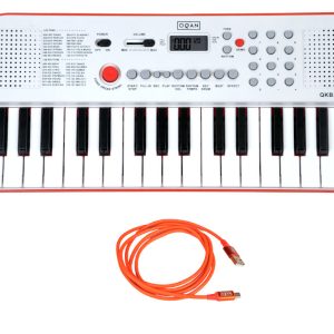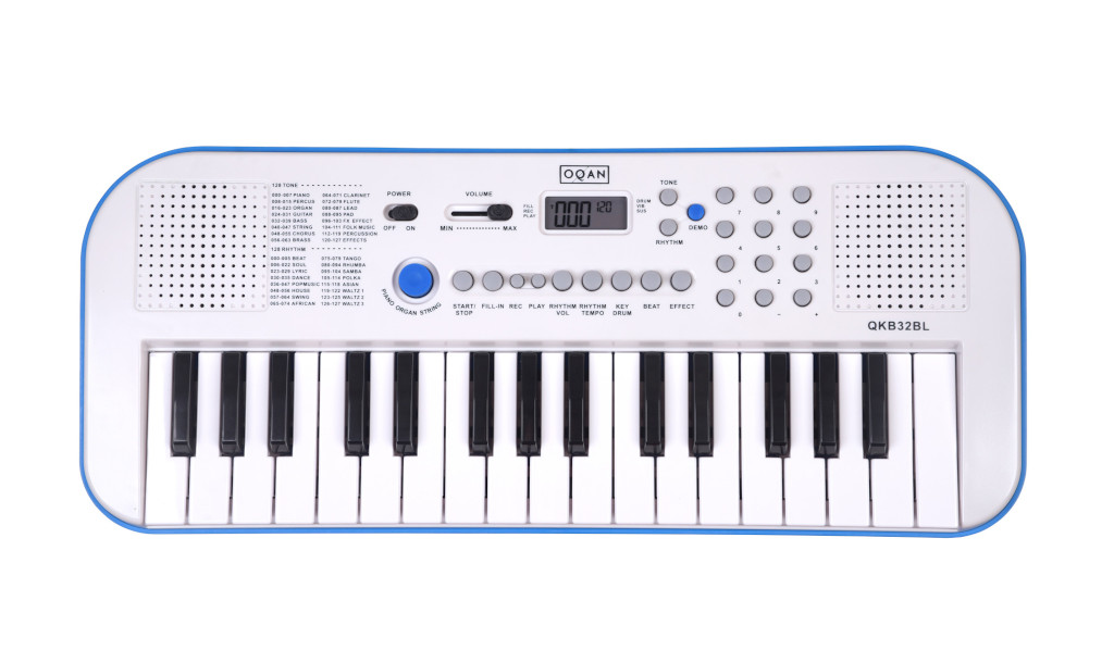 TECLADO DE ACOMPAÑAMIENTO CON ALTAVOCES Los teclados Oqan QKB32 son el regalo ideal para que los más pequeños de la casa se inicien en el fantástico mundo de la música. Disponibles en 2 colores -blanco/rojo y blanco/azul, su diseño atractivo y divertido, y sus completas prestaciones, ofrecen todo un mundo de posibilidades musicales con un manejo fácil e intuitivo. 32 Teclas Mini, 128 Sonidos / 128 Ritmos, 30 Canciones de Demostración, Metrónomo,, Funciones Vibrato / Sustain, Modo Percusión en el Teclado, Función de Grabación y Reproducción, Alimentación a pilas (6 x AA – no incluidas) o mediante el puerto micro USB integrado, entrada para alimentador DC (no incluido). Salida de auriculares, Dimensiones: 470 x 200 x 51 (mm).